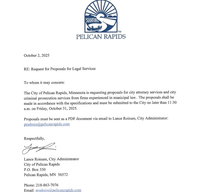 The City of Pelican Rapids is requesting proposals for city attorney services and city criminal prosecution services from firms experienced in municipal law. The proposals shall be made in accordance with the specifications and must be submitted to the City no later than 11:30 a.m. on Friday, October 31st. For a complete copy of the request for proposal, please contact City Administrator, Lance Roisum at [email protected] or (218)-863-7076.